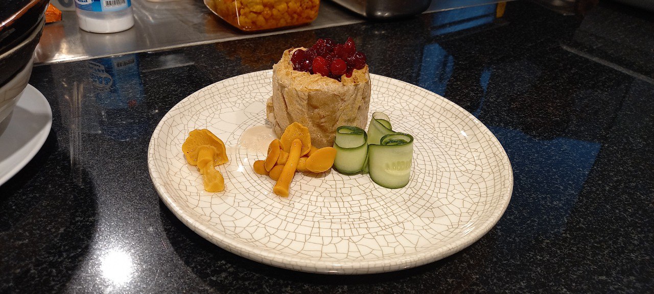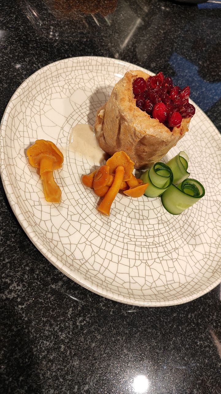 • Пирог русский с нутрией и белыми грибами. С соусом из клюквы и опятами маринованными.