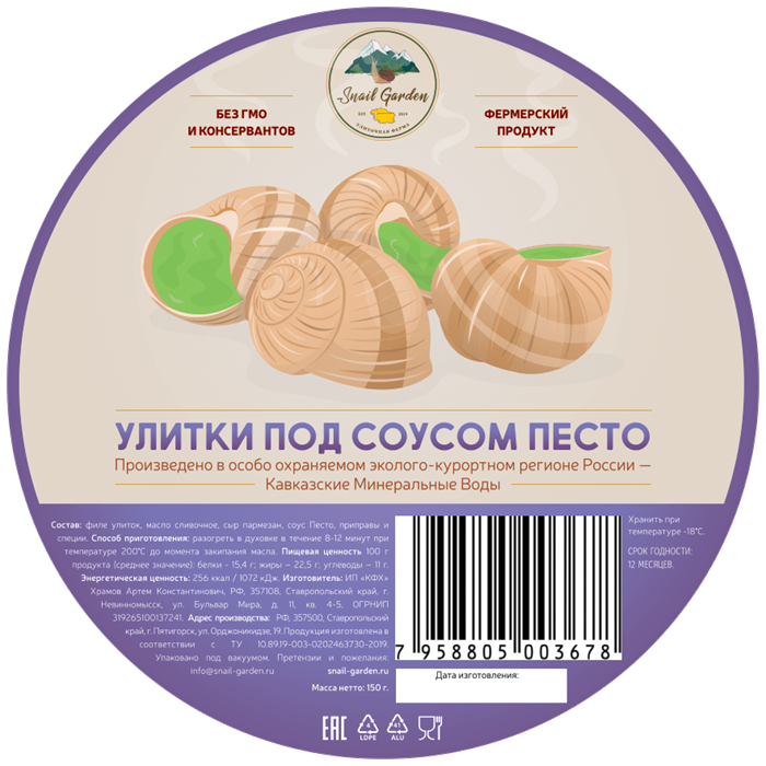 Состав: филе улиток, масло сливочное, сыр пармезан, соус Песто, приправы и специи
