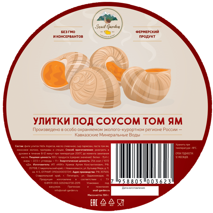 | Состав: | Филе улиток Helix Aspersa, масло сливочное, сыр пармезан, паста том ям, кокосовое молоко, приправы и специи. |