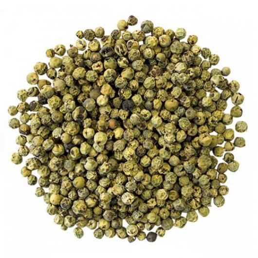 Перец зеленый горошком получают из молодых ягод перечной лианы. Их собирают на ранней стадии вызревания, что позволяет сохранить зеленый цвет. Вкус у приправы мягче других разновидностей перца. Он освежающий, нежный и пряный. Помимо приятного вкуса, продукт обладает общеукрепляющими и омолаживающими свойствами. Калорийность зеленого перца горошком невысокая и составляет около 40 килокалорий на 100 граммов сушеного продукта. Особой популярностью зеленый перец пользуется при приготовлении чаев, кофе и закусок. Он также подходит для маринования и засолки рыбы, куриного мяса, крольчатины; овощей и корнеплодов, баклажанов и всех видов капусты.